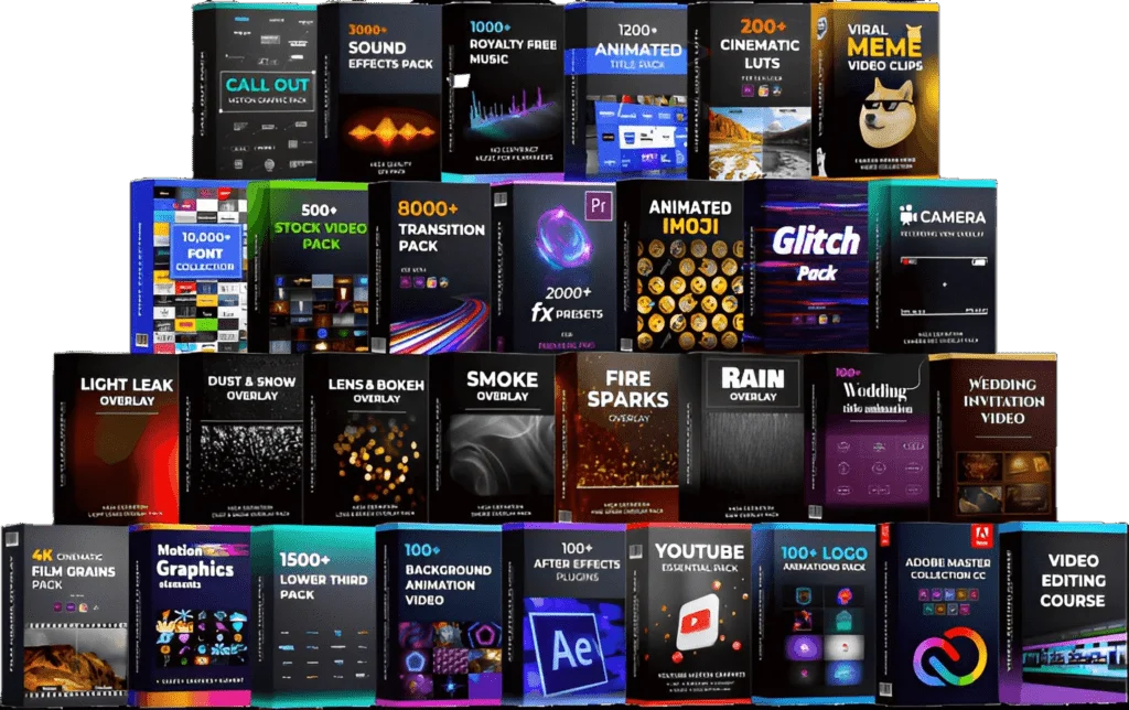 The bundle includes a variety of transitions, overlays, effects, text animations, LUTs, and more, designed to enhance your video editing projects.